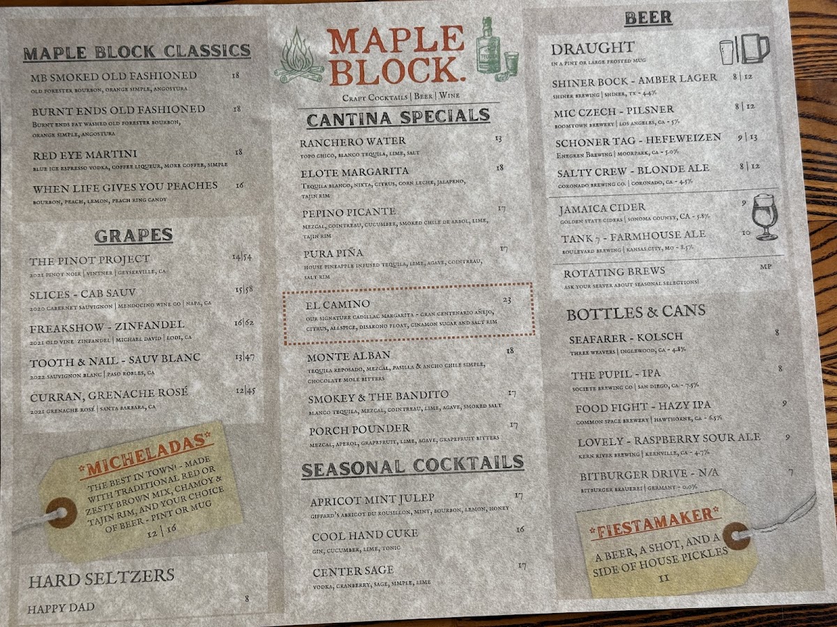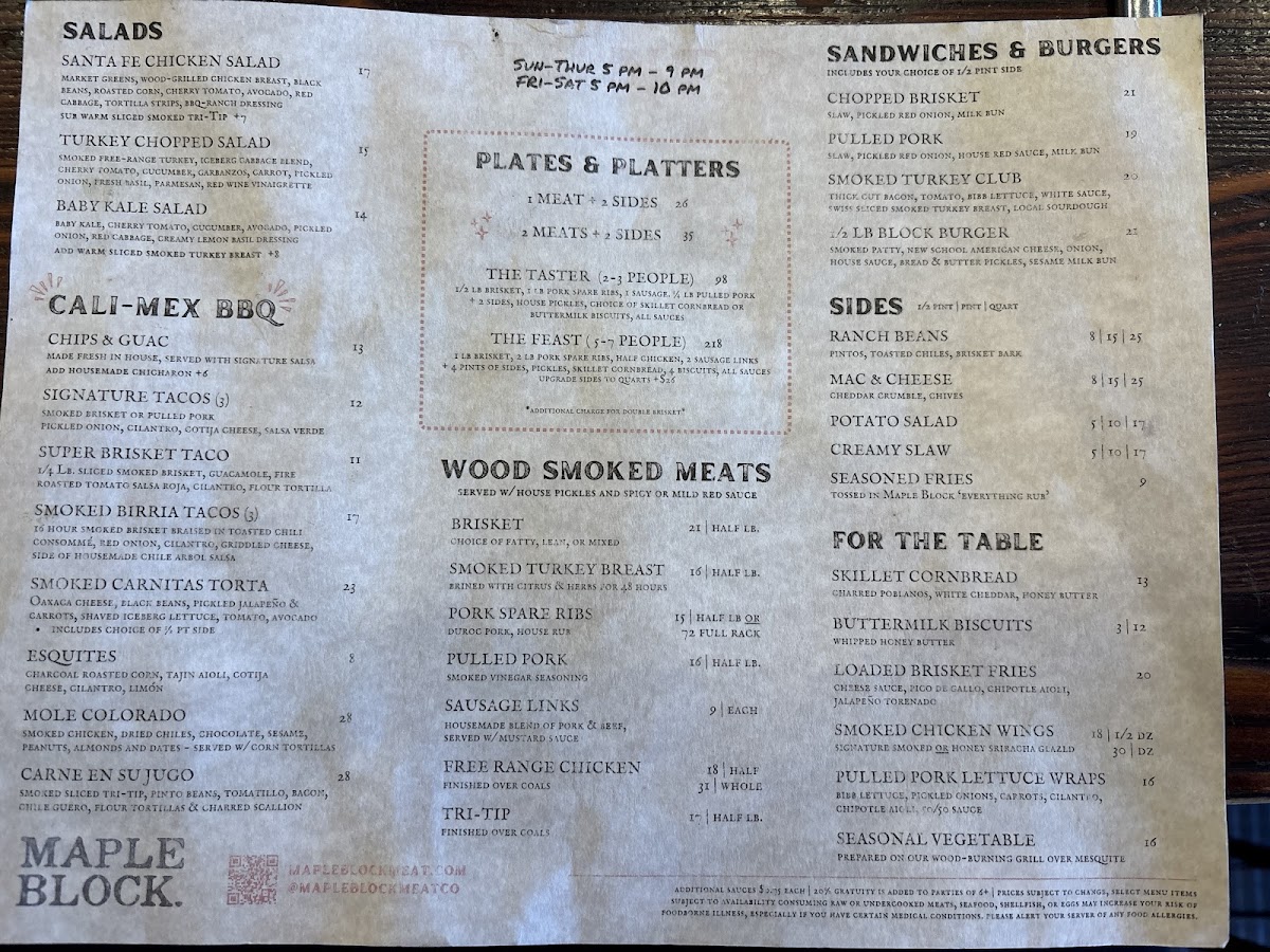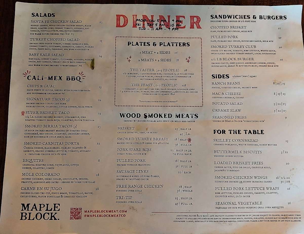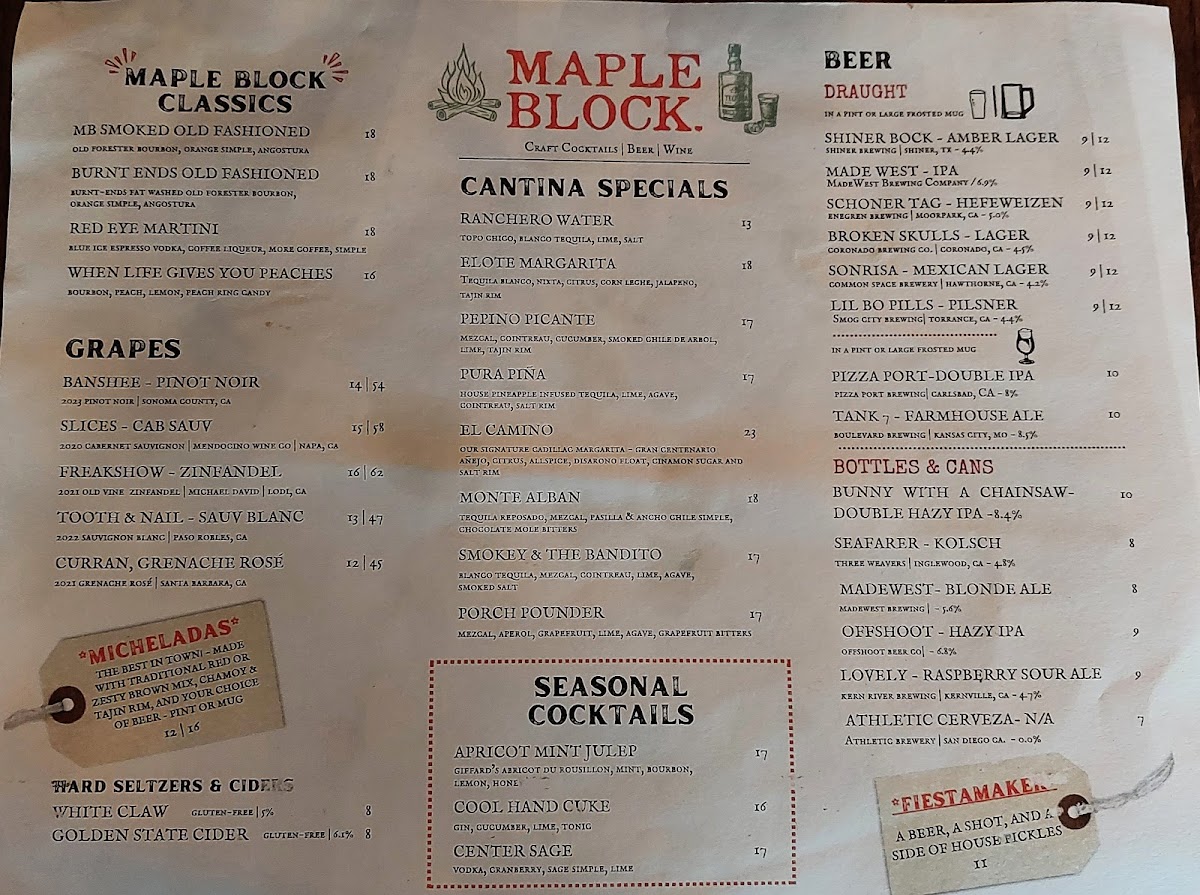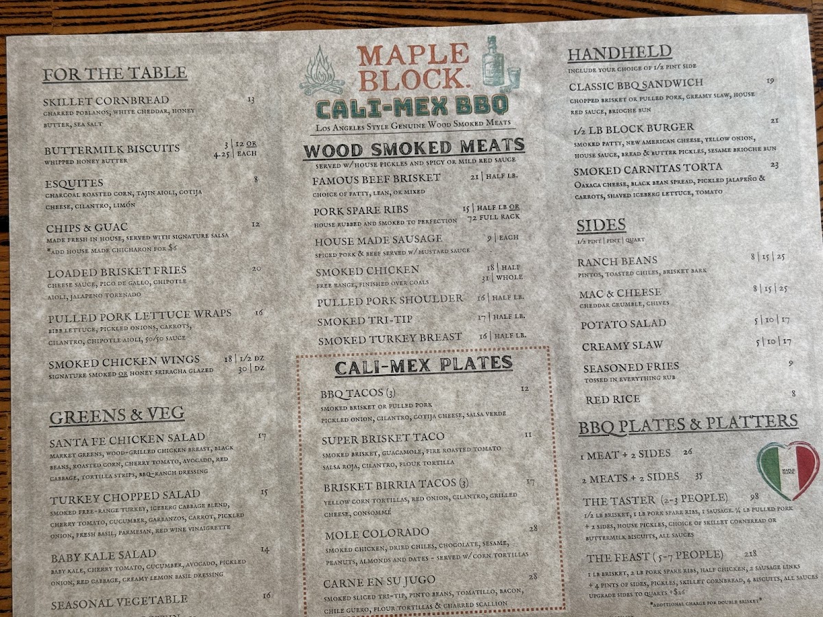 At Maple Block, you'll embark on a culinary journey through the rich, smoky flavors that define classic barbecue. The standout is undoubtedly their wood-smoked meats, featuring a mouthwatering sliced brisket served with pickled onions and a house-made red sauce that beautifully complements the tender meat. For those craving something a bit different, the 3 Pack Brisket Tacos offers a delightful fusion of CaliMex flavors that will have you yearning for more. Don't miss out on the housemade smoked sausage, which is made right on-site, providing a burst of flavor with every bite.